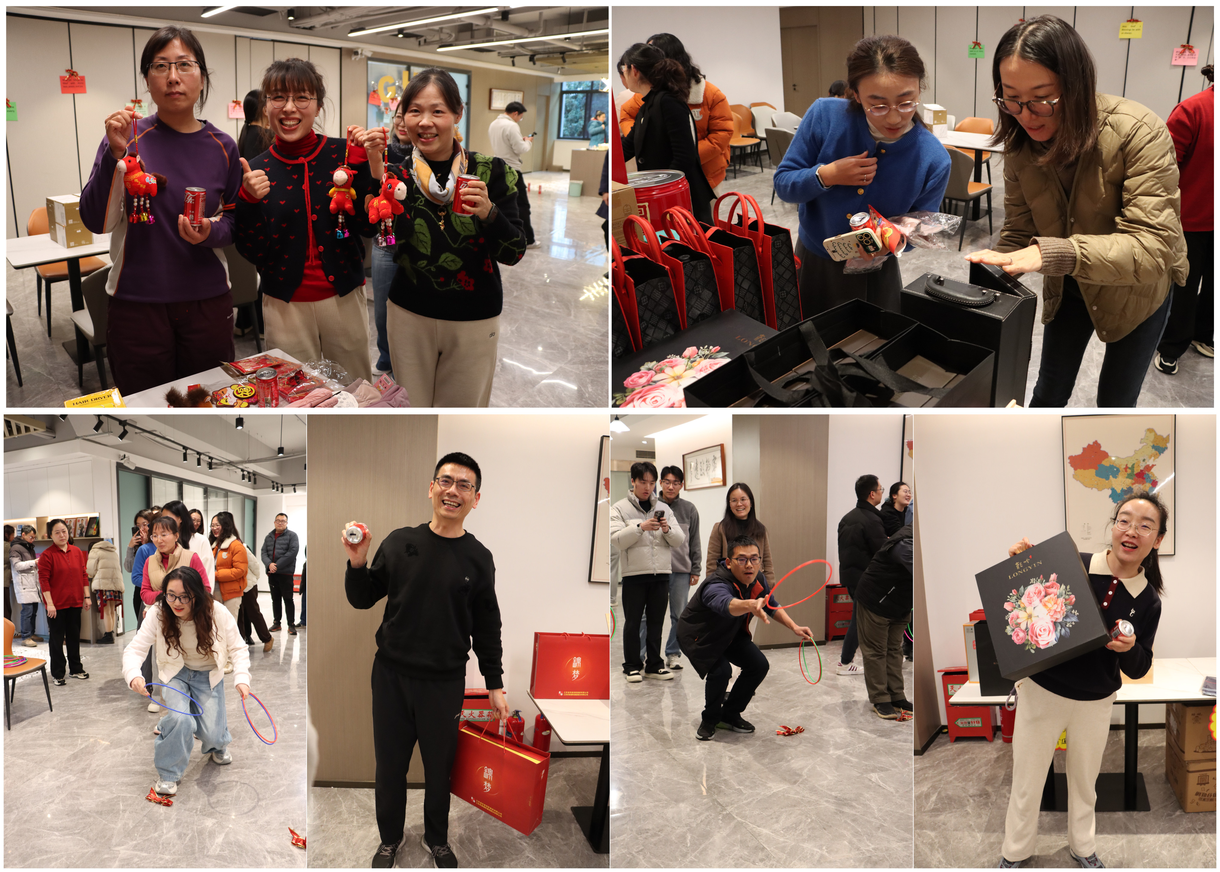 套圈赢好礼活动率先点燃现场欢乐,活动区域内,一瓶瓶可乐整齐摆成大大的“GHW”英文字母形状,丰富多彩的实用礼品整齐陈列。员工们秩序井然地排队参与,每人手持3个套圈,眼神专注瞄准目标,满是期待。瞄准、投掷、命中!现场不时响起轻快的欢呼与欢笑声,“100%中奖”的设置让每位参与者都满载而归,为节日增添了别样趣味。