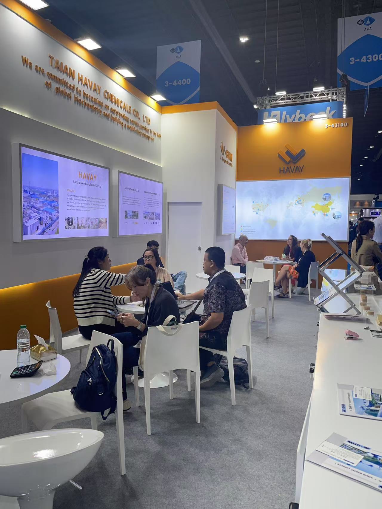 展会现场,我司甲胺产业系列-氯化胆碱、甜菜碱以及碘衍生物系列及配套产品-碘和硒矿物质等重点产品亮相,吸引了来自东南亚、欧洲、非洲等地区的众多新老客户前来咨询交流。